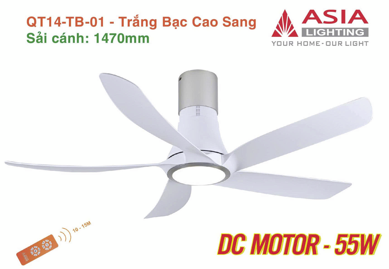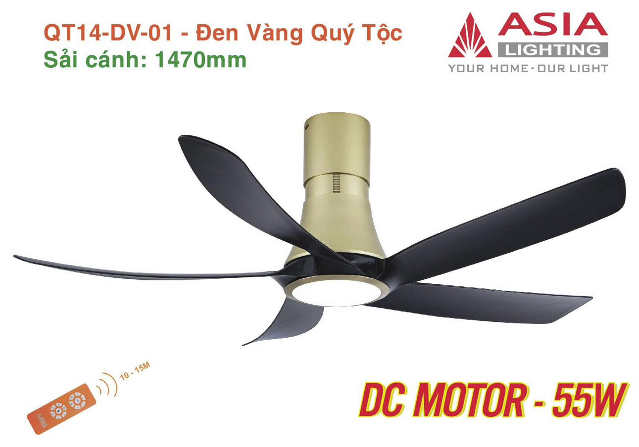 QUẠT TRẦN ĐÈN 5 CÁNH CAO CẤP ASIA LIGHTING - Model QT14: - Thiết kế hiện đại, tinh tế. - Động cơ DC công nghệ mới siêu tiết kiệm. - Công suất động cơ 55W kết hợp sải cánh 1470mm siêu gió mát. - 04 chế độ hẹn giờ - 06 cấp độ gió. - Điều hòa không khí với 06 chế độ gió đảo chiều. - Đèn led siêu sáng 24W kết hợp 03 chế độ ánh sáng. - Cánh bằng nhựa ABS siêu bền. - Ốp trần có thể điều chỉnh tới 10cm giúp tăng tối đa thẩm mỹ khi lắp đặt. - Mầu sắc hiện có: + Trắng bạc cao sang: QT14-TB-01. + Đen vàng quý tộc: QT14-DV-01 - Bổ sung 03 mầu mới: + Nâu cà phê: QT14-N-01 + Gỗ phong cách: QT14-G-01 + Đồng vàng quý tộc: QT14-DV-02 - Bảo hành 24 tháng.